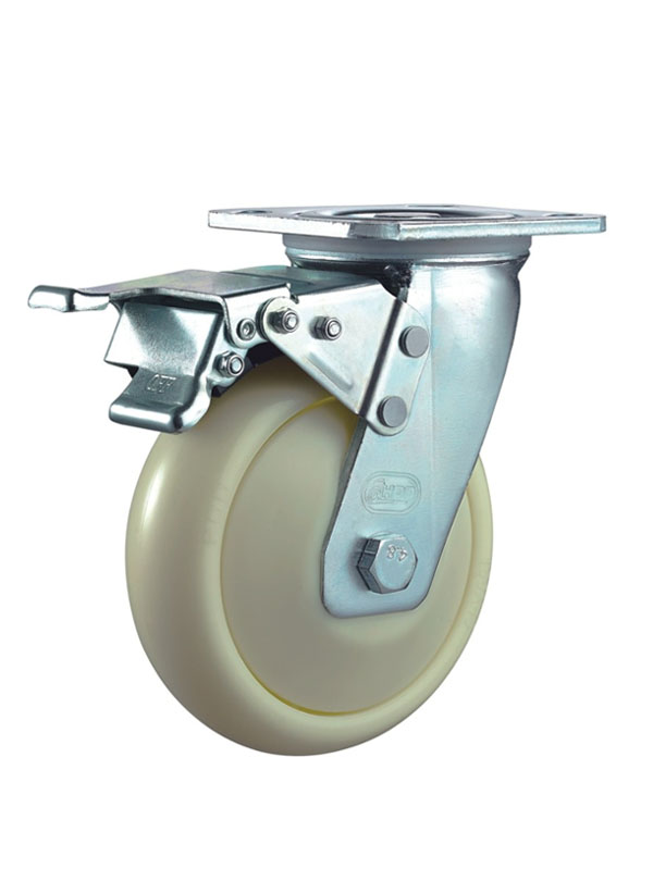 5寸萬向腳輪是常見(jiàn)的萬向腳輪尺(chǐ)寸,它常被用作於手推車腳輪,這個(gè)尺寸的腳輪用在手推車上,比較符合成(chéng)年人的身高,這種高度下的手推車,推(tuī)動起(qǐ)來,不太費勁,搬動貨物到手推車上(shàng)也較為容易,在推動推車和搬動貨物之間,比較均衡。下麵腳輪生產廠小編就跟大(dà)家介紹5寸萬向腳輪: